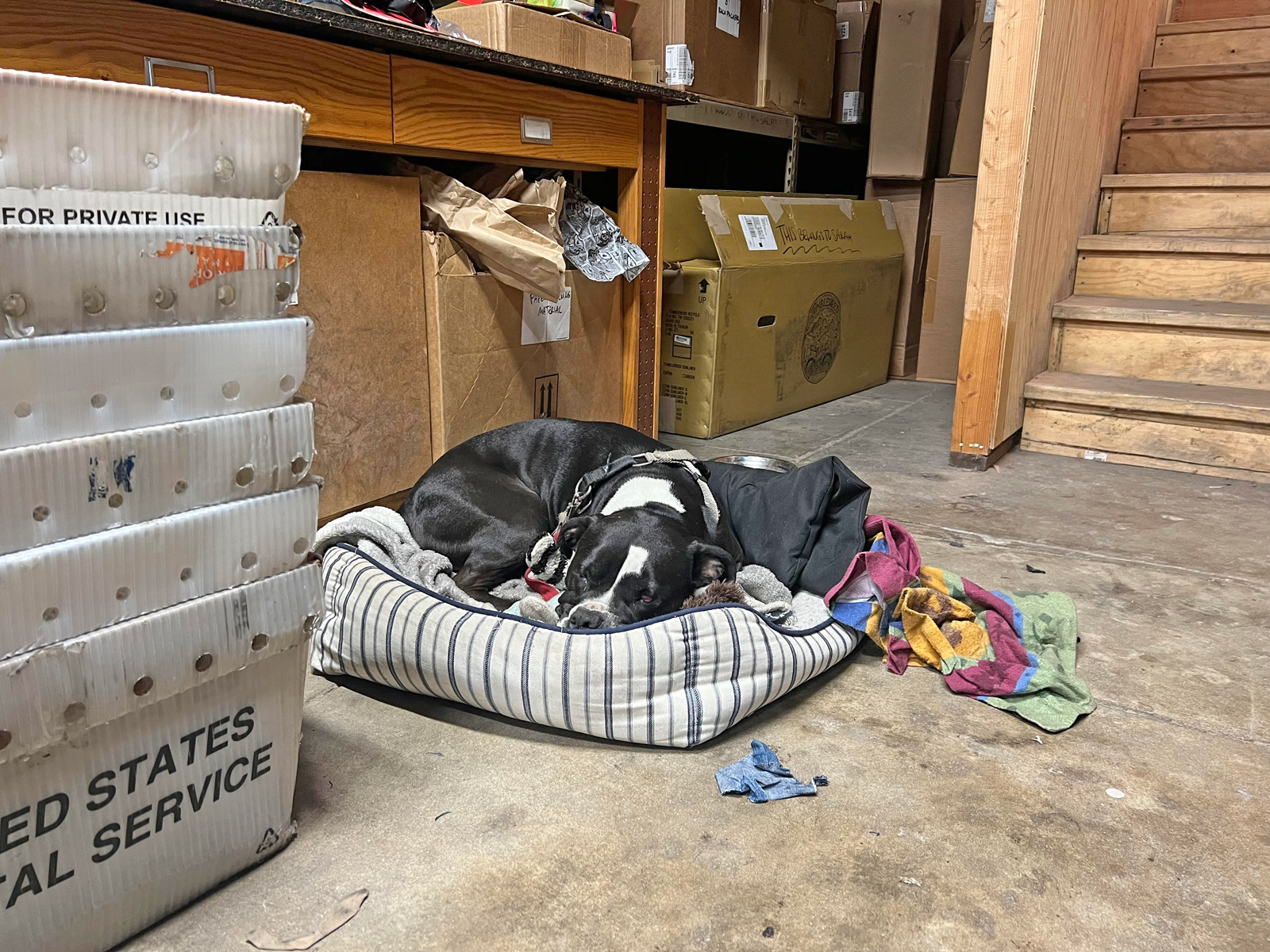 Last week, while Elliot dried out all his bikepacking gear, I had the pleasure of having Susan hangout downstairs at my desk. Since I don’t have pets of my own anymore, this fulfils my need to occasionally lean over and start talking baby talk, to the closest animal. Lucky for me, Susan is always happy to receive pets and seems to tolerate my baby talk better than anyone else!