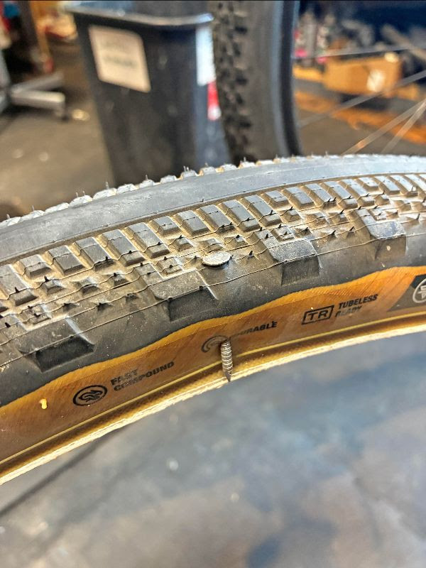 This week I replaced a tire that had been pierced by a nail on Paul’s bike. The tubeless sealant did its job and sealed up the holes for 300 miles. I’m always amazed when I see the objects that tubeless can seal.