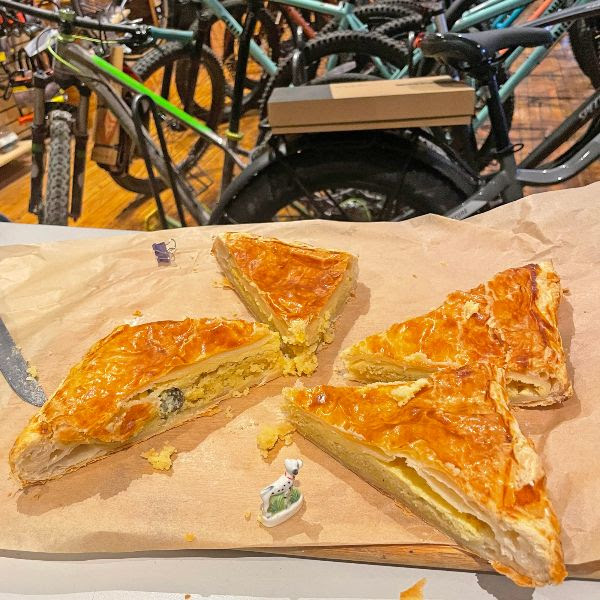 Last week was Kings Day in France. Our work Neighbor Phillipe is from France and runs a cool XRay research lab called Examinart. We always help them with their bikes and they show us cool stuff and some love. The love this week was Galette des Rois a beautiful puff pastry with almond filling and porcelain figurines inside.