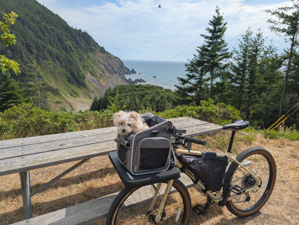 David brings Miya in with him whenever he comes to the shop, because he knows how much we love her, and we found out recently that she also knows when she’s getting close to the shop and starts going crazy in the car when they pull up. David just did a rad trip cycling down the coast with Miya and was gracious enough to share some pictures from their travels with us. Here is an epic shot of Miya in her comfortable basket setup hanging out at a park on the Oregon coast.