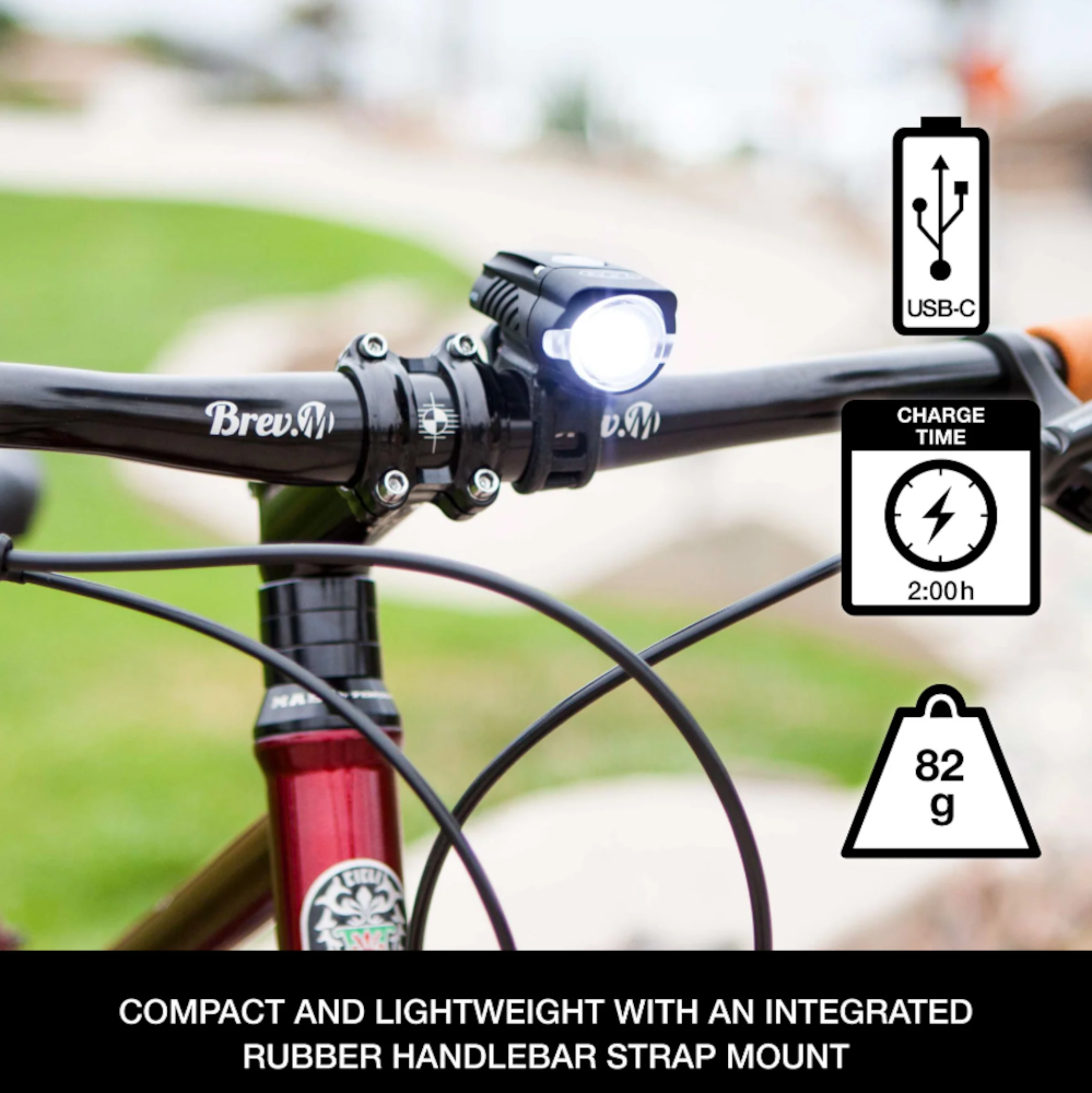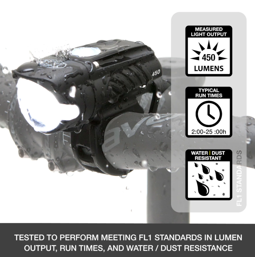 The Swift™ 450 gives you more than enough lumens at our lightest weight for headlights (82 grams). NiteRider® makes this headlight USB rechargeable for convenient on-the-go charging. The Swift™ 450 features a highly durable light housing with Durable Fiberglass reinforced nylon meeting all required FL1 Standards for impact testing and water / dust resistance.